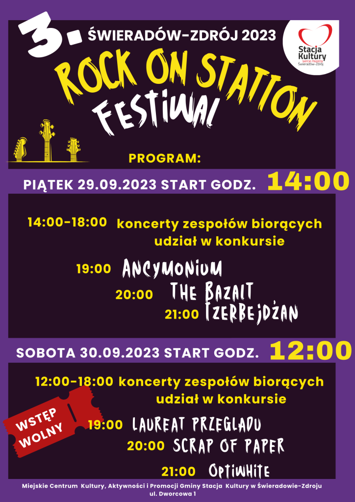 Zaczynamy odliczanie do trzeciej edycji Rock on Station – festiwalu rockowej muzy w Stacji Kultury! Już 29.09.2023 w piątek od godz. 14:00 ul. Dworcową 1 w Świeradowie-Zdroju zawładną rockowe brzmienia. Gwiazdą wieczoru w piątek będą Ancymonium, The Bazalt i Izerbejdżan! Natomiast w sobotę 30.09.2023 oprócz zespołów konkursowych zagrają Scrap of Paper, Optiwhite oraz Laureat Konkursu!! […]