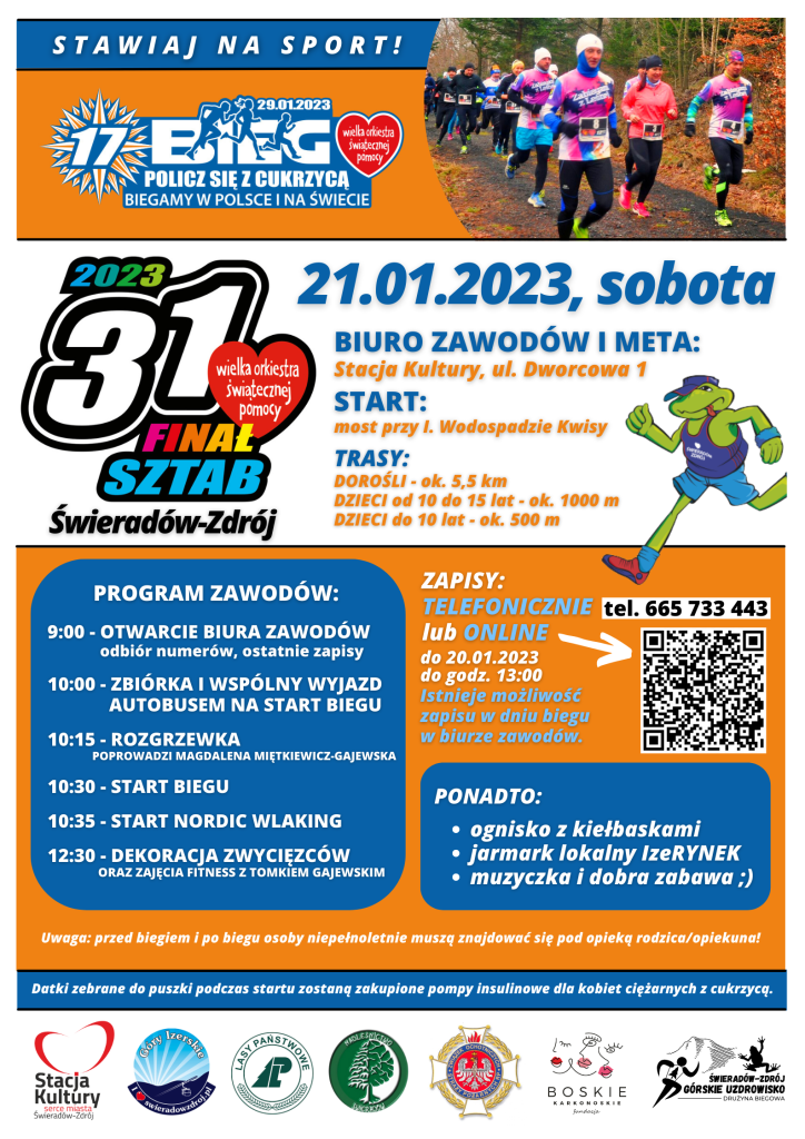 Zapraszamy do udziału w 17. Biegu WOŚP „Policz się z cukrzycą” Kiedy?21.01.2023, sobota Gdzie?BIURO ZAWODÓW I META:Stacja Kultury, ul. Dworcowa 1START:most przy I. Wodospadzie Kwisy PROGRAM ZAWODÓW:9:00 – OTWARCIE BIURA ZAWODÓWodbiór numerów, ostatnie zapisy10:00 – ZBIÓRKA I WSPÓLNY WYJAZD AUTOBUSEM NA START BIEGU10:15 – ROZGRZEWKApoprowadzi Magdalena Miętkiewicz-Gajewska10:30 – START BIEGU10:35 – START NORDIC WLAKING12:30 – DEKORACJA ZWYCIĘZCÓW PONADTO:ognisko […]