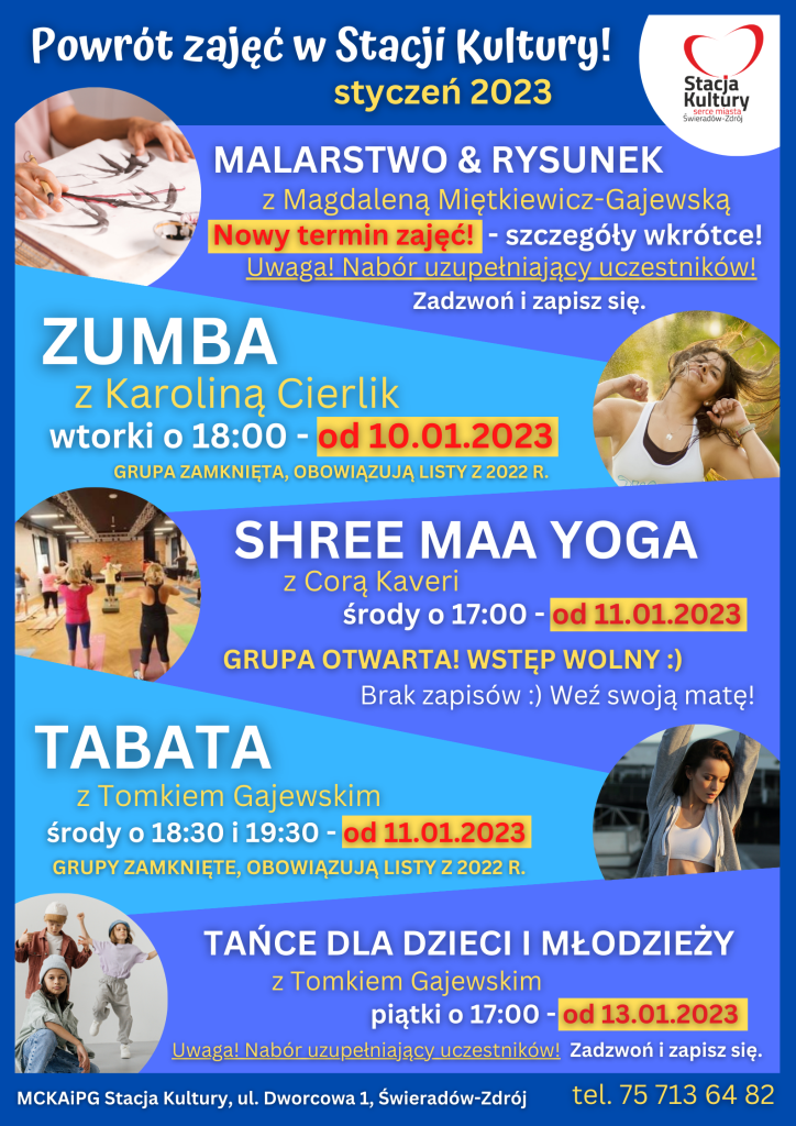 Po świątecznej przerwie wracają znane i lubiane zajęcia w Stacji Kultury Powyżej rozpiska i szczegóły Do zobaczenia na Stacji!