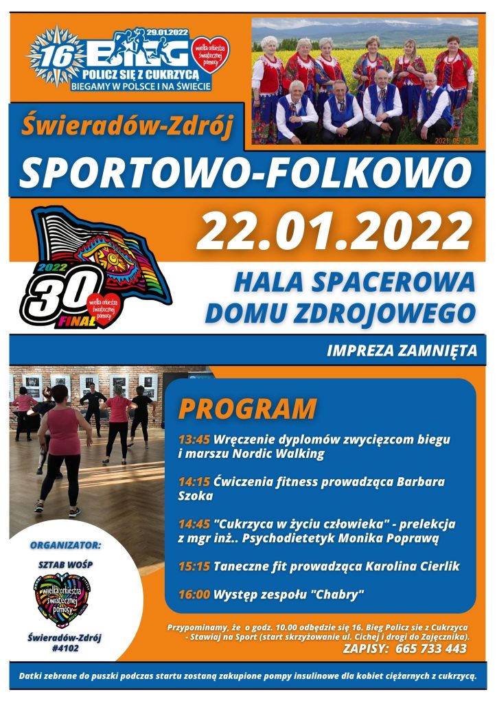 Znamy już program „Świeradów-Zdrój SPORTOWO-FOLKOWO”, czyli imprezy towarzyszącej 16. Biegowi „Policz się z cukrzycą” Będzie się działo! Zajęcia fitness, wykład psychodietetyka oraz koncert znanych i lubianych Chabrów z Kwieciszowic Zapraszamy 22.021.2022 do Hali Spacerowej Domu Zdrojowego w Świeradowie-Zdroju Szczegóły na plakacie!