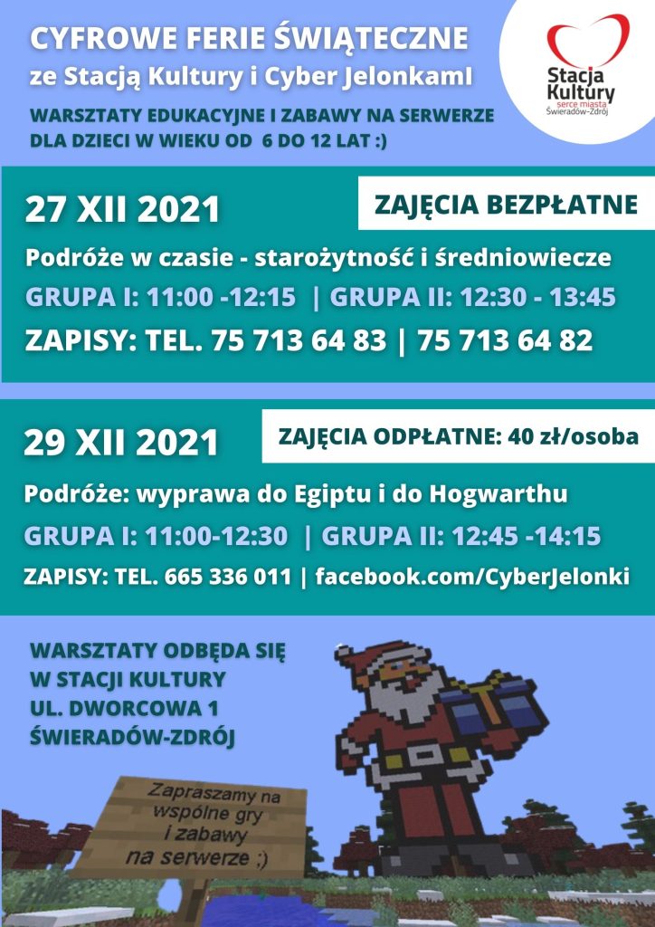 Uwaga, uwaga! Właśnie ruszyły zapisy na warsztaty edukacyjne i zabawy na serwerze w ramach Cyfrowych Ferii Świątecznych – organizowanych przez nas we współpracy z Cyberjelonki Zajęcia skierowane są do Dzieci w wieku 6-12 lat Warsztaty 27.12.2021 są bezpłatne i zapisy na nie zbierane są w Stacji Kultury (tel. 75 713 64 82). Zajęcia 29.12.2021 są […]