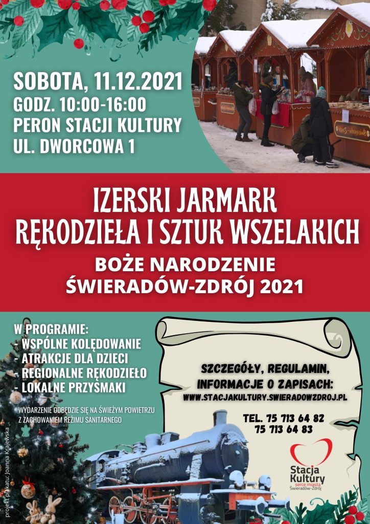 Mamy przyjemność ogłosić, że tegoroczny Izerski Jarmark Rękodzieła i Sztuk Wszelakich odbędzie się 11.12.2021 w godz. 10:00-16:00 na peronie Stacji Kultury Zapraszamy serdecznie do udziału w wydarzeniu! Z kolei wystawców, którzy chcieliby wystawić się na Jarmarku ze swoimi wyrobami, prosimy o kontakt mailowy: stacjakultury@swieradowzdroj.pl lub telefoniczny: 75 713 64 83
