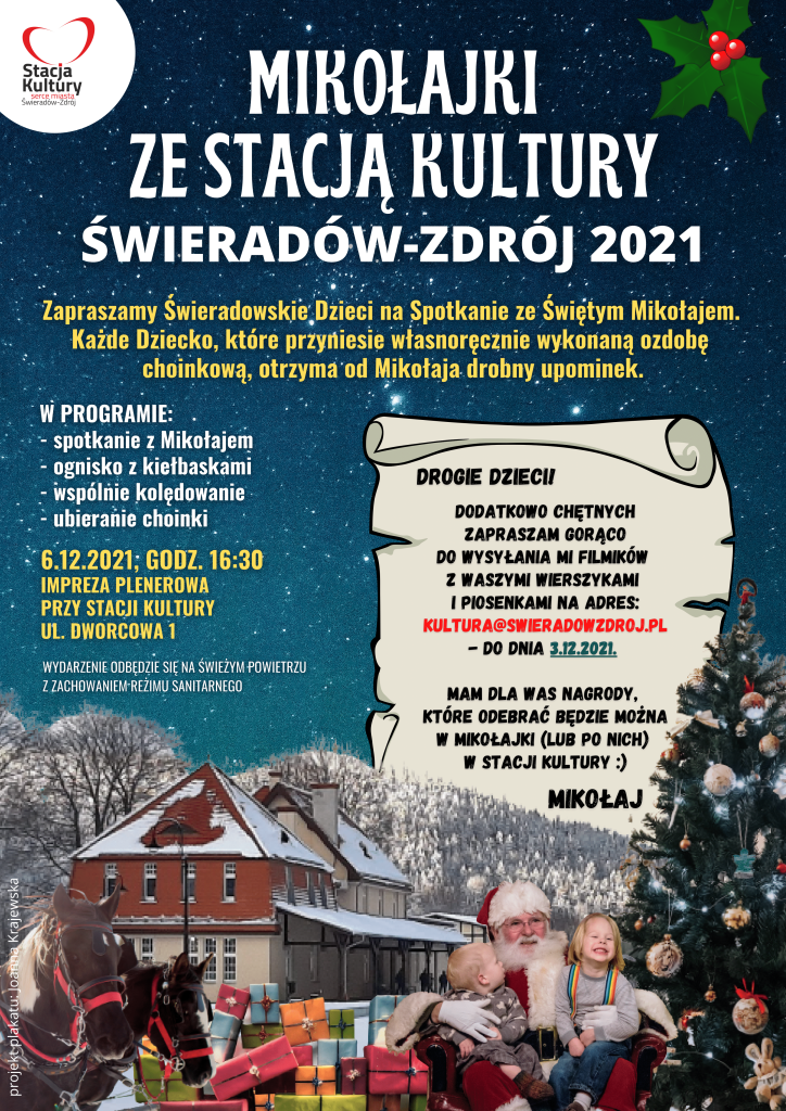 Kochani! Właśnie odebrałyśmy list z Laponii! Wygląda na to, że już wiemy, kto stoi za pierwszym śniegiem tej zimy Święty Mikołaj poinformował nas, że jak co roku zjawi się na Stacji Kultury w Mikołajki, czyli już za tydzień w poniedziałek – 6.12.2021 o godz. 16:30. Mikołaj przygotował dla najmłodszych Świeradowian drobne upominki! Każde Dziecko, które […]