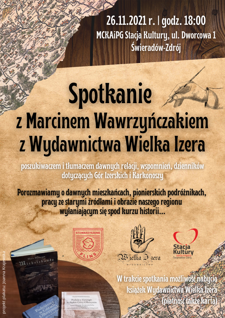 Już za tydzień w Stacji Kultury odbędzie się spotkanie z Marcinem Wawrzyńczakiem z Wydawnictwo Wielka Izera Regionalistę i tłumacza „odpytywać” będzie Bartosz Kijewski ze Stowarzyszenie Flins, które jest współorganizatorem wydarzenia O czym będzie mowa? Tematów nie zabraknie, szczególnie, że niedawno do sprzedaży trafiło kolejne tłumaczenie Pana Marcina – „Podróż z Turyngii w śląskie Góry Olbrzymie” […]