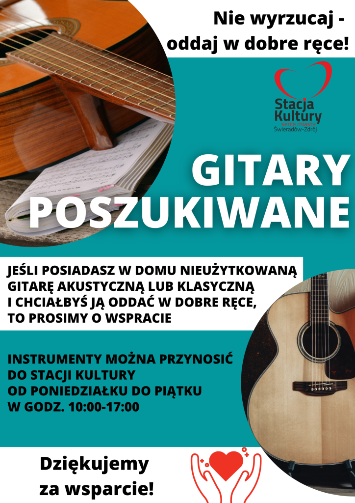 Gitary poszukiwane Jeśli komuś zalega i kurzy się w domu gitara akustyczna lub klasyczna i chciałby ją oddać w dobre ręce, wspierając przy tym początkujących gitarzystów, to prosimy o wsparcie.Nieużytkowane instrumenty można dostarczyć do Stacji Kultury.