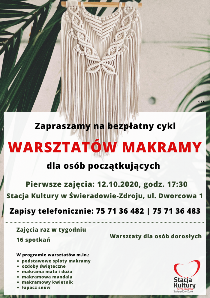 AKTUALIZACJA: zapisy wyłącznie na listę rezerwową. Marzysz o samodzielnie wykonanych dekoracjach do wnętrz? Jeśli tak, to serdecznie zapraszamy na bezpłatne WARSZTATY MAKRAMY, które poprowadzi ponownie Katarzyna Bojkowska! Cykl warsztatów przewiduje 16 spotkań. Zajęcia odbywać się będą raz w tygodniu. Każde z zajęć potrwają ok. 2,5 godz. Zajęcia adresowane do osób dorosłych. Pierwsze zajęcia już w […]
