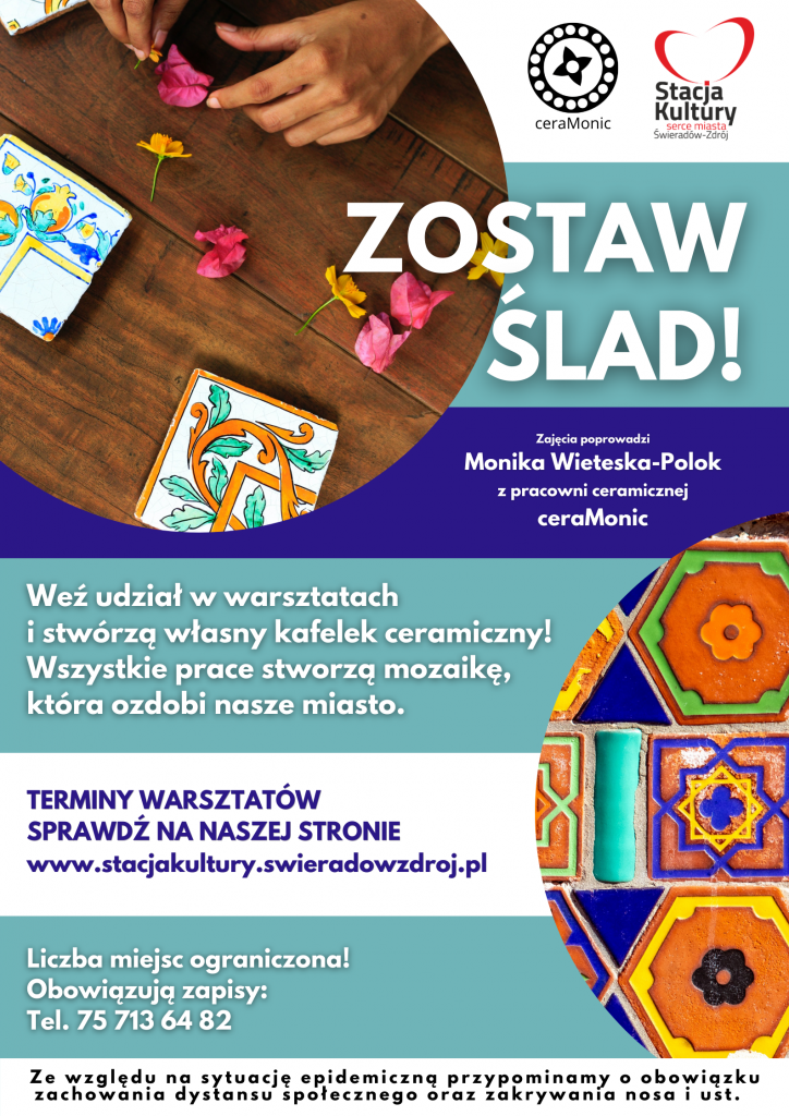 Informujemy, że ze względu na nowe obostrzenia związane z epidemią koronawirusa warsztaty ceramiczne „ZOSTAW ŚLAD” odbędą się w innych terminach. O nowych datach i godzinach będziemy informować na bieżąco, kiedy obostrzenia sanitarne zostaną złagodzone i zajęcia ponownie będą mogły odbywać się w naszym obiekcie.