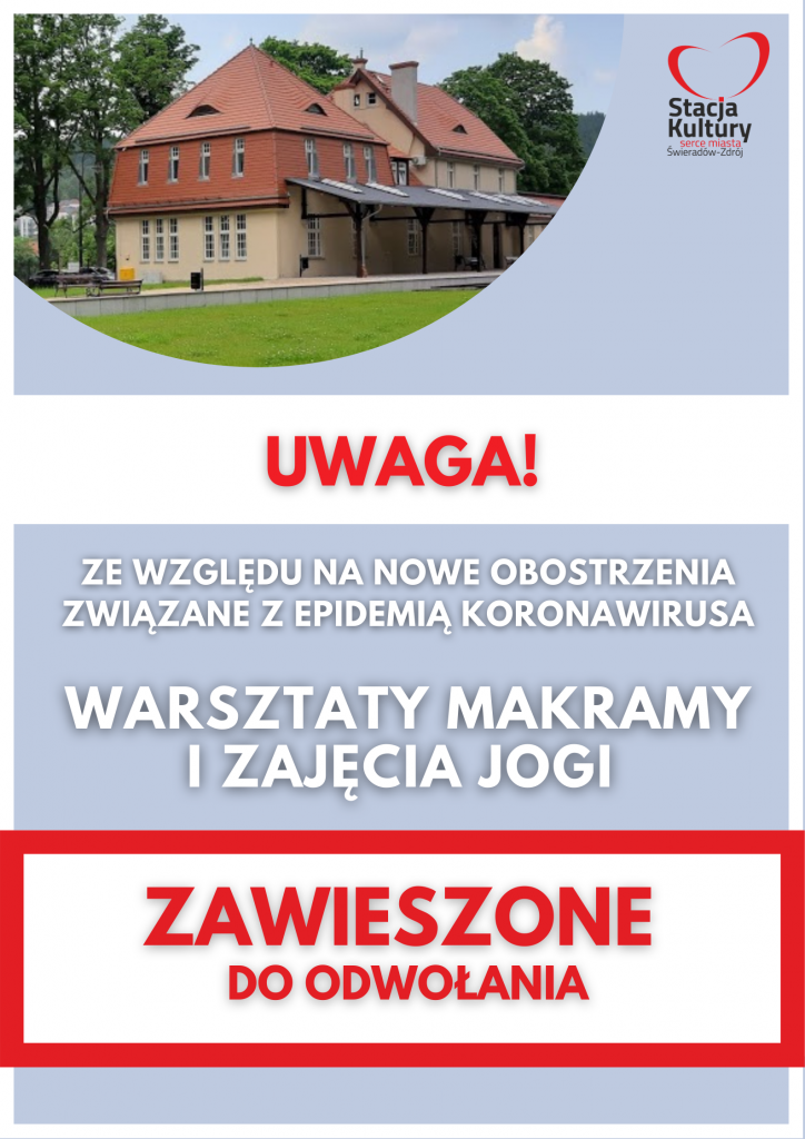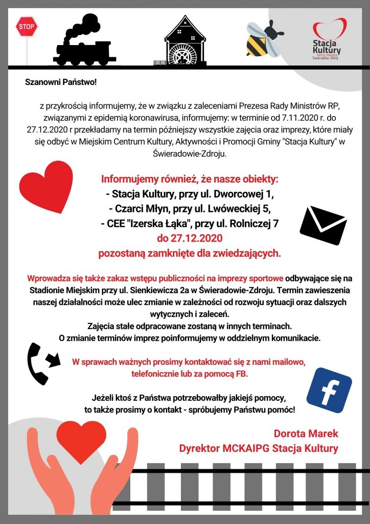 Szanowni Państwo! z przykrością informujemy, że w związku z zaleceniami Prezesa Rady Ministrów RP, związanymi z epidemią koronawirusa, informujemy: w terminie od 7.11.2020 r. do 27.12.2020 r przekładamy na termin późniejszy wszystkie zajęcia oraz imprezy, które miały się odbyć w Miejskim Centrum Kultury, Aktywności i Promocji Gminy „Stacja Kultury” w Świeradowie-Zdroju. Informujemy również, że nasze […]