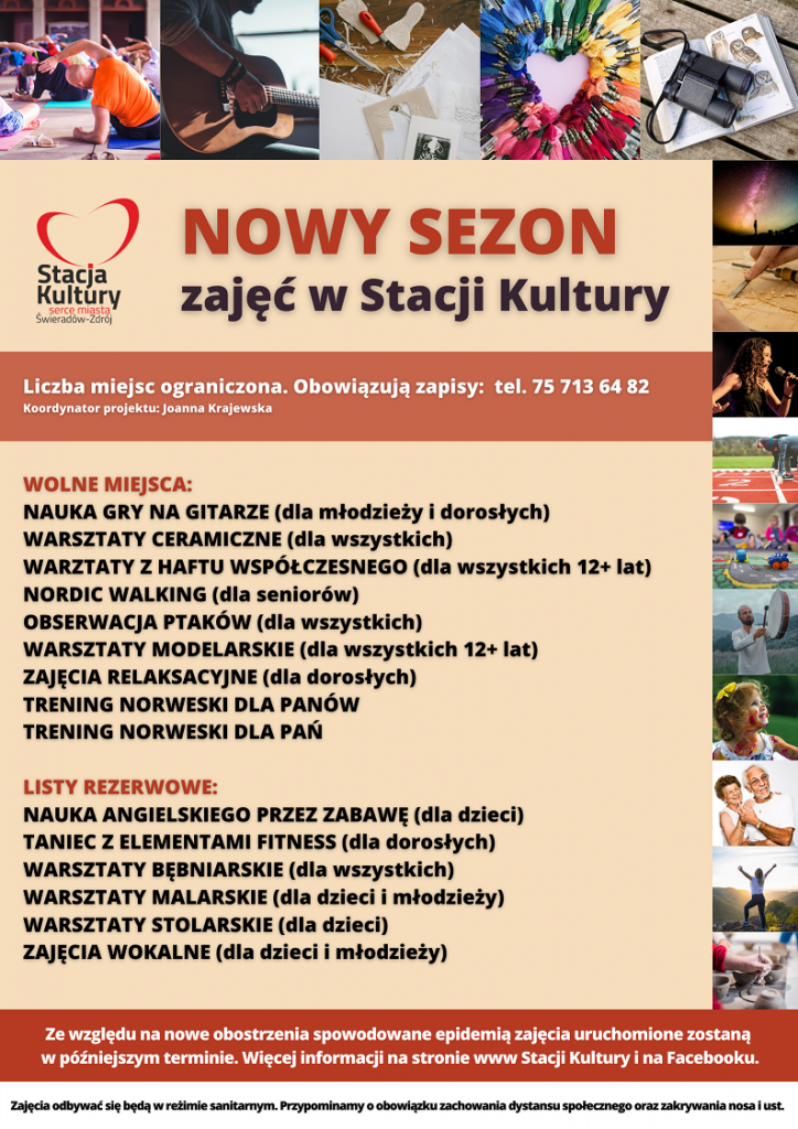Niestety, ze względu na nowe obostrzenia związane z epidemią, zmuszeni jesteśmy ponownie zawiesić odbywające się aktualnie zajęcia. O ponownym uruchomieniu zajęć będziemy informować na bieżąco na naszej stronie internetowej oraz na Facebooku Stacji Kultury.
