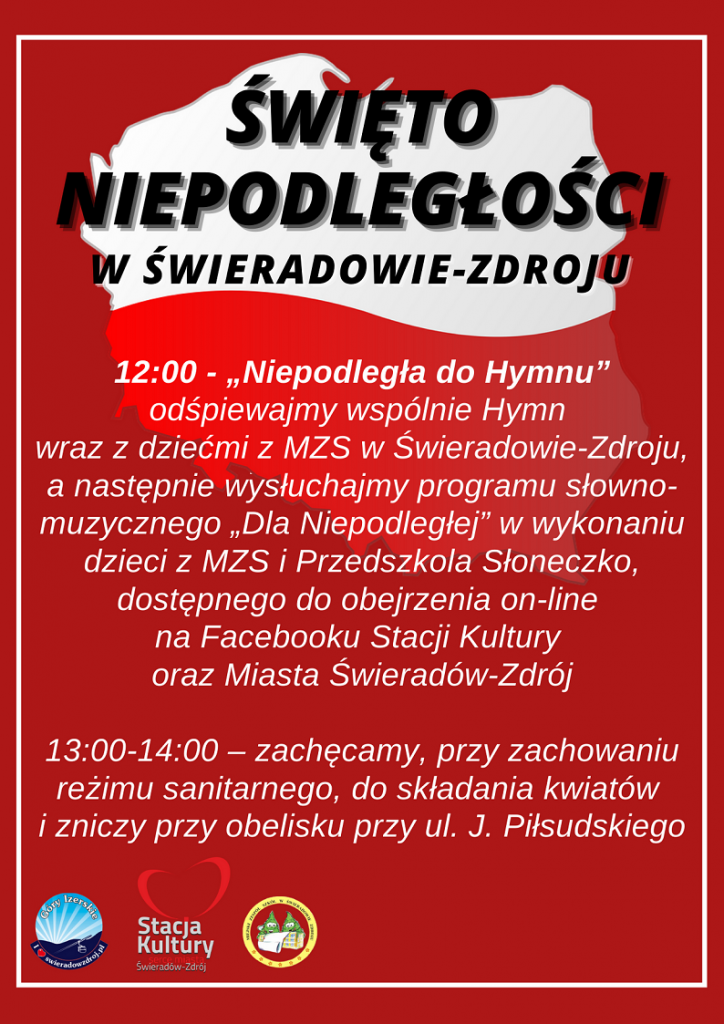 ZAPRASZAMY – 11 listopada 2020 r.Święto Niepodległości w Świeradowie-Zdroju 12:00 – „Niepodległa do Hymnu” odśpiewajmy wspólnie z dziećmi z Miejskiego Zespołu Szkół w Świeradowie-Zdroju Hymn, a następnie wysłuchajmy programu słowno-muzycznego „Dla Niepodległej” w wykonaniu dzieci z MZS i Przedszkola Słoneczko dostępnego do obejrzenia on-line na Facebooku Stacji Kultury oraz Miasto Świeradów-Zdrój. 13:00 – 14:00 – […]