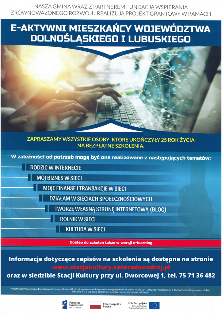 Zapraszamy wszystkie osoby powyżej 25 roku życia na bezpłatne szkolenia komputerowe! 24-25.08.2020, w godz. 8.00-14.00 – szkolenie z modułu Mój biznes w sieci;24-25.08.2020, w godz. 14:00-20:00 – szkolenie z modułu Tworzę własną stronę internetową (blog).Szkolenia kończą się wydaniem certyfikatu. Miejsce szkoleń: Stacja Kultury w Świeradowie-Zdroju, ul. Dworcowa 1. Zapisy w Stacji Kultury przy ul. Dworcowej 1, tel. […]