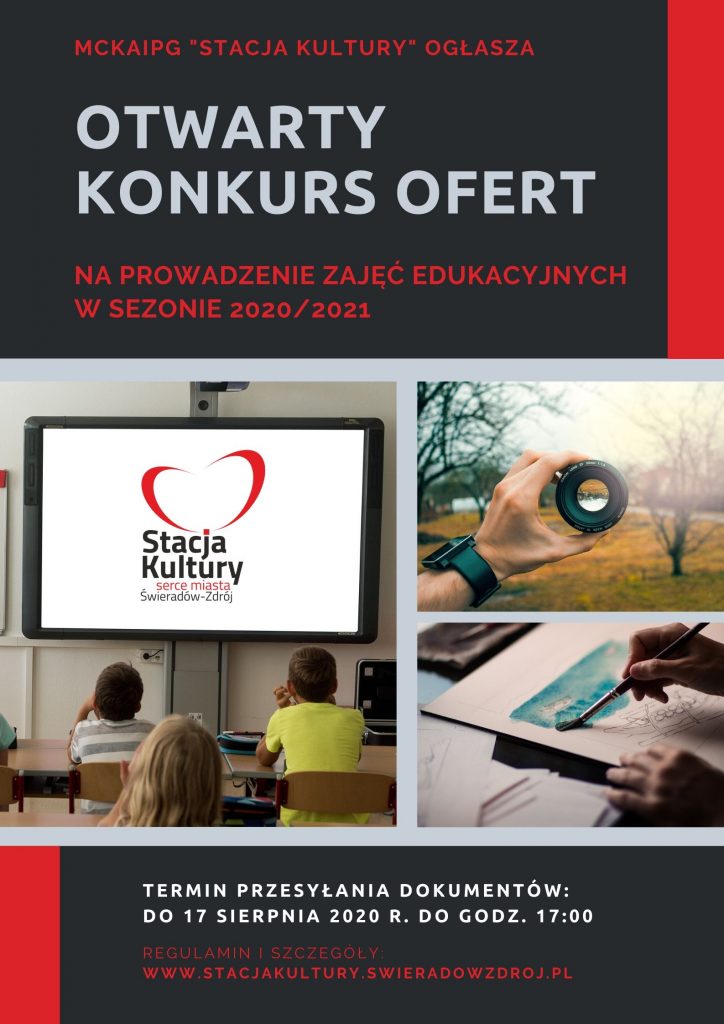 Miejskie Centrum Kultury, Aktywności i Promocji Gminy „Stacja Kultury” w Świeradowie-Zdroju ogłasza: OTWARTY KONKURS OFERT NA PROWADZENIE ZAJĘĆ ARTYSTYCZNYCH, KULTURALNYCH I EDUKACYJNYCH W SEZONIE 2020/2021 Regulamin konkursu i formularz ofertowy znajdą Państwo w załącznikach poniżej. Skany wypełnionego i podpisanego formularza należy przesyłać na adres kultura@swieradowzdroj.pl. W temacie proszę wpisać: „KONKURS ZAJĘCIA 2020/2021” Ostateczny termin nadsyłania […]