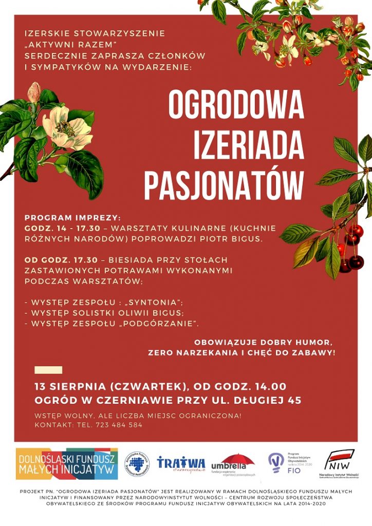 Izerskie Stowarzyszenie „Aktywni Razem” zaprasza członków i sympatyków na wydarzenie OGRODOWA IZERIADA PASJONATÓW Miejsce: ogród przy ul. Długiej nr 45 (os. Czerniawa) Termin: 13 sierpnia 2020 r. (czwartek), od godz. 14.00 Program imprezy: godz. 14.00-17.30 – warsztaty kulinarne (kyuchnie różnych narodów) poprowadzi Piotr Bigus od godz. 17.30 – biesiada przy stołach zastawionych […]