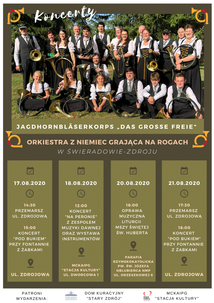 Zapraszamy serdecznie na koncerty Jagdhornbläserkorps „Das Große Freie“ – orkiestry z Niemiec grającej na rogach! PROGRAM: 17.08.2020, ul. Zdrojowa godz. 14.30 – Przemarsz ul. Zdrojową godz. 15.00 – Koncert „Pod Bukiem” przy fontannie z żabkami 18.08.2020, MCKAIPG „Stacja Kultury”, ul. Dworcowa 1 12.00 – Koncert „Na Peronie” wraz z Zespołem Muzyki Dawnej, wystawa instrumentów wykonanych […]