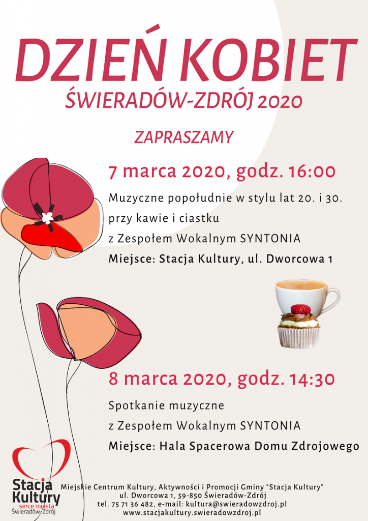 Stacja Kultury oraz Zespół Wokalny SYNTONIA zapraszają do wspólnego świętowania Dnia Kobiet! Szczegóły na powyższym plakacie.