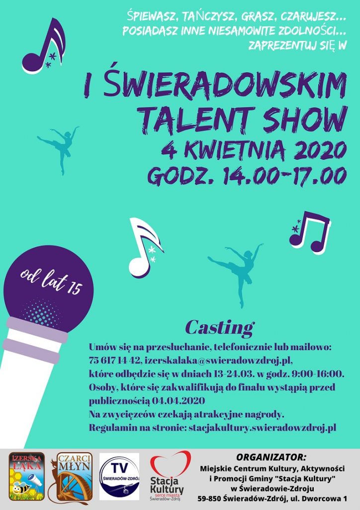 Z uwagi na sytuację epidemiologiczną w kraju, konkurs zostaje przełożony. Szczegóły wkrótce. Wszystkie osoby powyżej 15 roku życia zachęcamy do wzięcia udziału w I Świeradowskim Talent Show! Szczegóły na powyższym plakacie oraz w Regulaminie dostępnym poniżej. Regulamin Talent Show